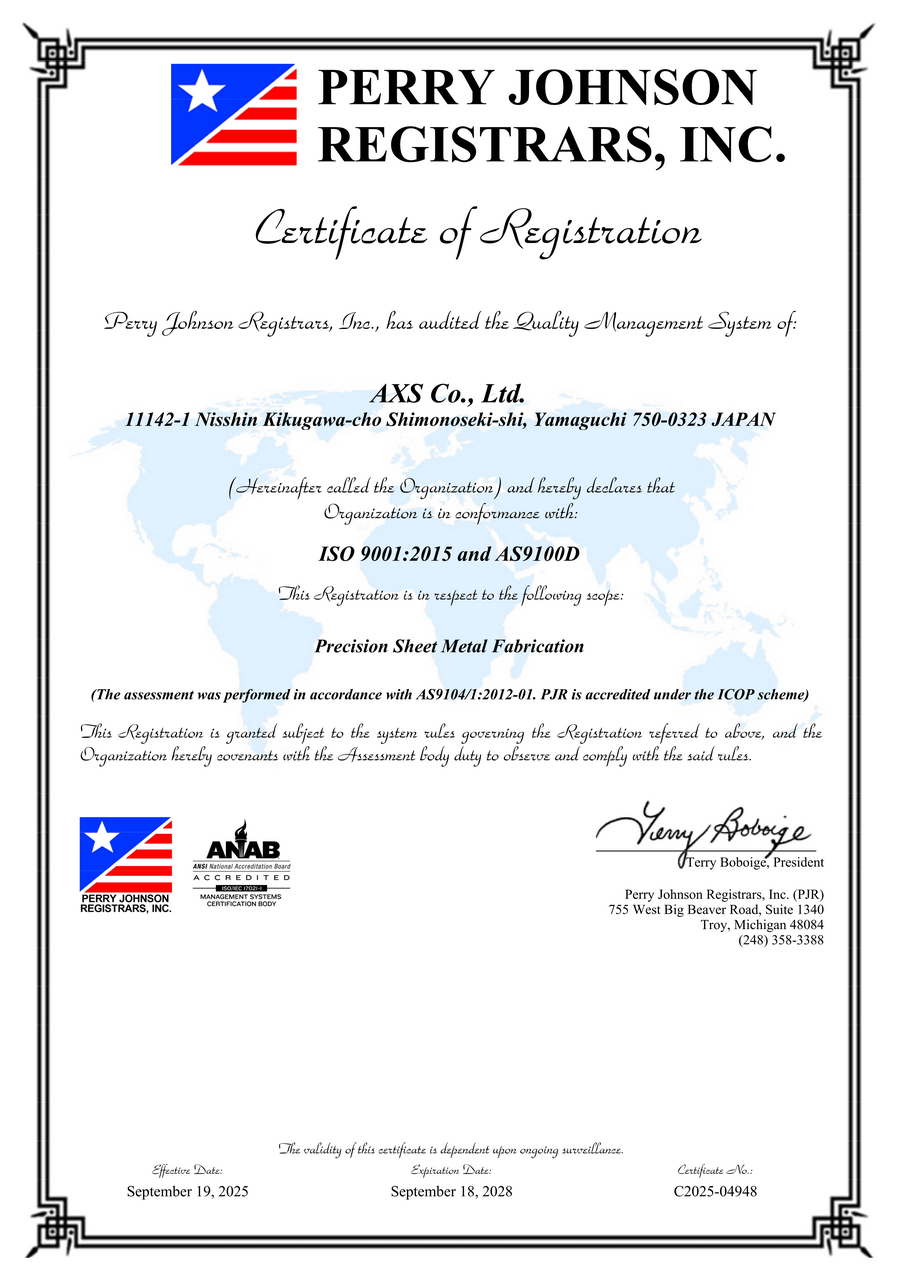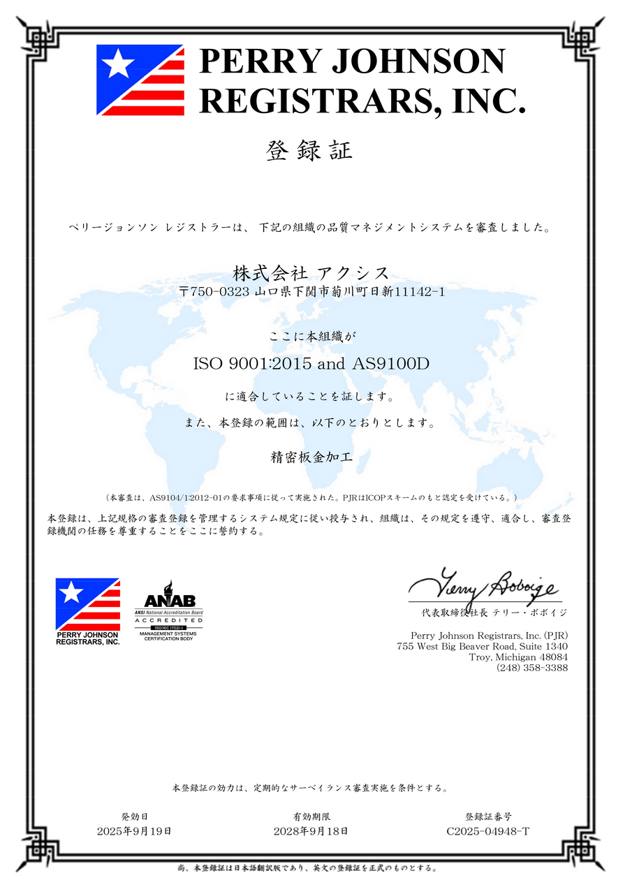 9月19日にISO 91001:2015 and AS9100D再認証登録を取得いたしました。