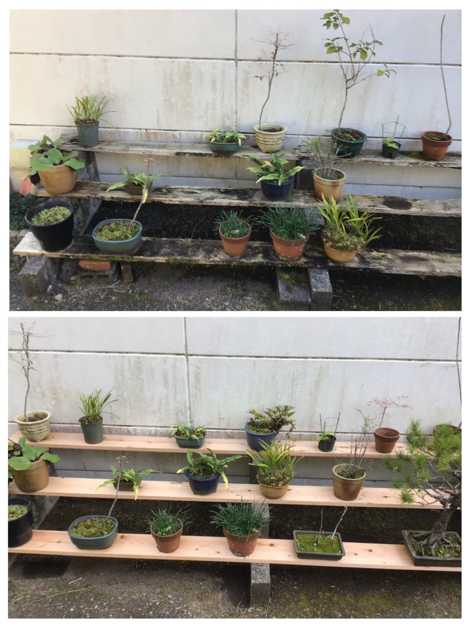 リフレッシュした下板は、盆栽や植木鉢の魅力をより一層引き立ててくれます。